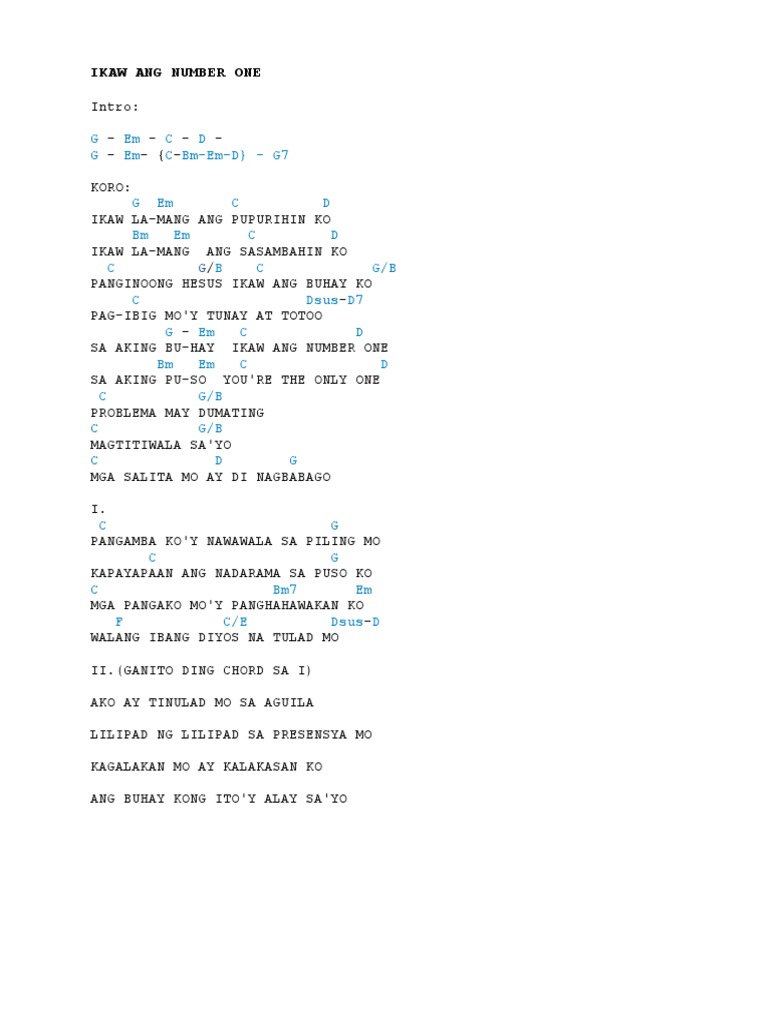 Ikaw ang Number 1. Hawak Mo kinabukasan ko Walang ikakatakot Panginoon Akoy hawak Mo. Instrumental C G Am F G Verse 2 C G Kapag ikay lumalapit akoy Am natutulala sa yong F C Magagandang ngiti sa akin At sanay mapakinggan G mo ang awitin kong Am to F Iisa lang ang pangarap ko sa C mundong ito G Ang makasama ka sa araw-araw Am F - G At makapiling ka sa habang buhay Pre-Chorus F Wag ka lang umalis wag ka lang umalis G.