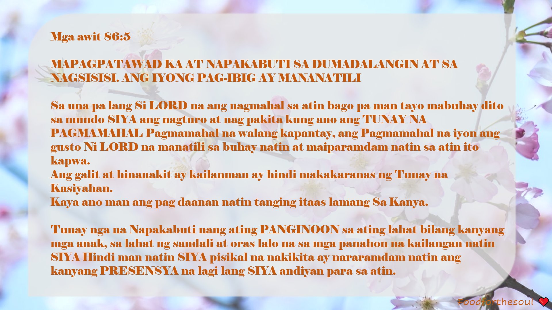 C Napkabuti Mo sa akin. Verse F FBb B CB FBb Gm C11 Aking nababatid na napakabuti Mo sakin F FBb B GC C11 C Aking namamasid ang katapatan Moy hindi mapatid-patid Pre Chorus B CB FBb Ebm7 Sa lahat ng ito ang tanging tugon ko Gm FBb B GC C11 C Ay awitan ka at mahalin at laging sambahin Chorus B Gm FBb Ebm Gaya ng mga ibon na. From the album Ikalawang Salmo.