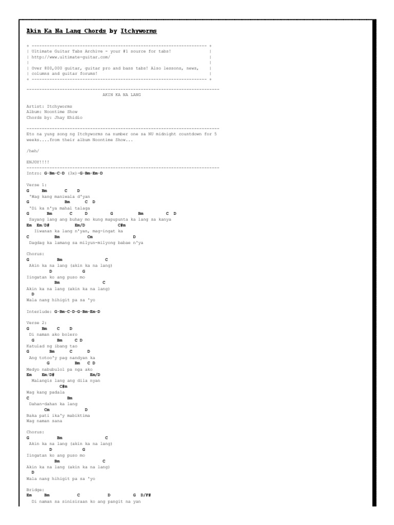Akin Ka Na Lang Chords by Itchyworms learn how to play chords diagrams Akin Ka Na Lang chords by Itchyworms with chords drawings easy version 12 key variations and much more. Jhay Ehidio ----- Intro G C G Am D G E Verse 1 Am D Nais kong magpakalasing G E Dahil wala ka na Am D Nakatingin sa salamin G G7 At nag-iisa C Nakatanim pa rin Ang gumamelang Cm Bm E Binalik mo sakin nang tayoy maghiwalay Am Itoy katulad Ng damdamin ko F D Kahit buhusan mo ng. Last edit on Feb 13 2014.