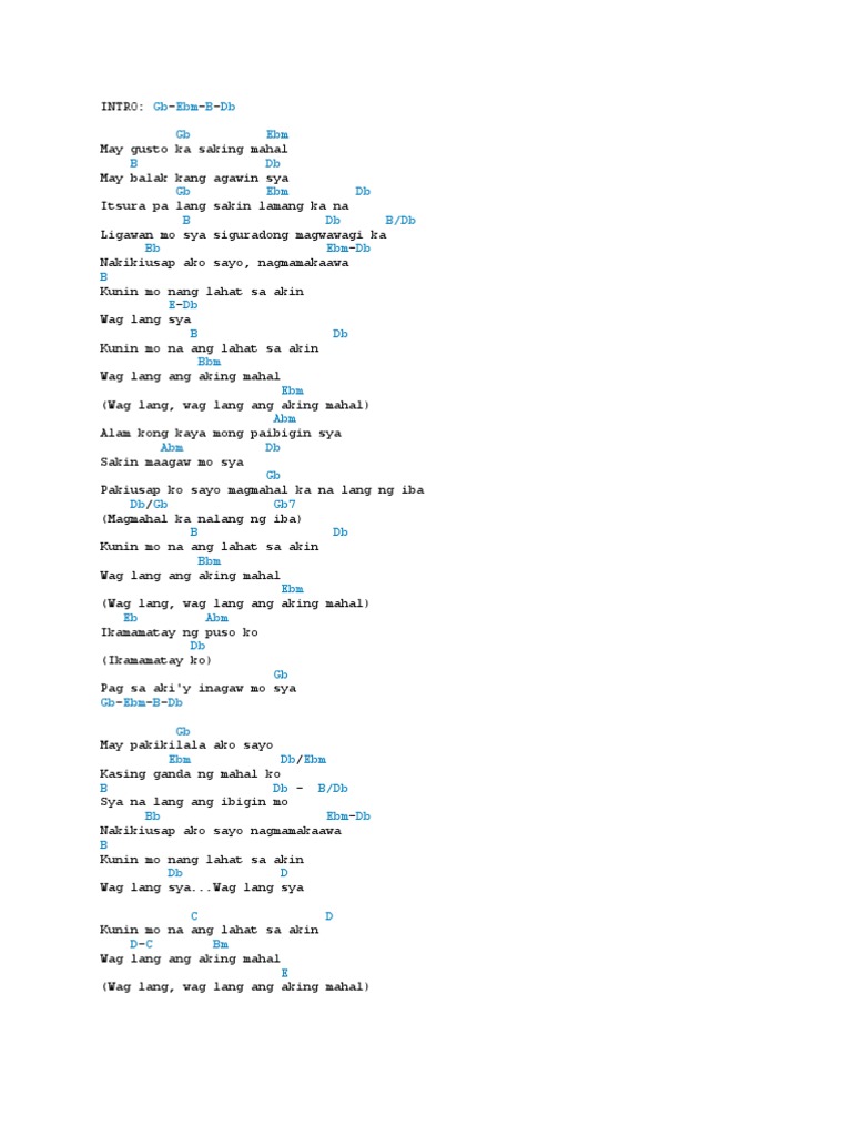 A Cm7 Bm7 Itanong mo sa akin E A - Cm7 - Bm7 - E Sinong aking mahal A Cm7 Bm7 Itanong mo sa akin E A - Cm7 - Bm7 - E At sagot koy di magtatagal Chorus. FDi ko kayang mag i Dmsa dahil kailanman Em7b5ay laging ikaw Ang syang Gmiibigin Cko sa tuwina FDi mo man sabihin Dmang nasa damdamin Em7b5ay nadaramang lumalayo Ka na nga Gmyon sa Cakin FKung ma F7hal mo si Bbya ay Cpipilitin Amko Di mo Dmmakita na Gmdi ko Ckaya FKung ma F7hal mo si Bbya di Cmo mari Amrinig sa a Dmkin Ang m. Cm Huwag sanang sasaktan CmB D Ang puso na sayoy nagmahal.