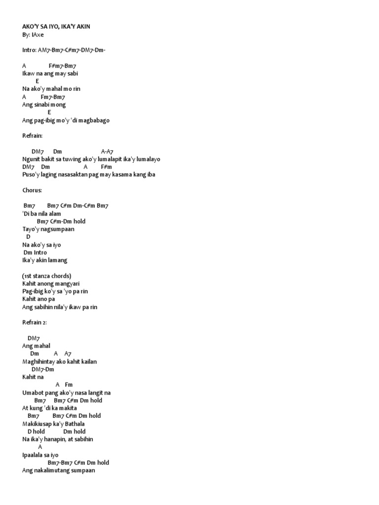 Akoy Sayo Ikay Akin AkoY SaYo IkaY Akin Lamang Song by Daniel Padilla Lyrics Ikaw na ang may sabi na akoy mahal mo rin At sinabi mong ang pag-ibig moy di magbabago Ngunit bakit sa tuwing akoy lumalapit ikay lumalayo Pusoy laging nasasaktan pag may kasama kang iba Di ba nila alam tayoy nagsumpaan Na akoy sa iyo at ikay akin lamang Kahit anong mangyari pag. Create and get 5 IQ. Intro Amaj7 Bm Cm Dmaj7 Dm 2x Verse 1 A Fm Ikaw na ang may sabi Bm E Na akoy mahal mo rin A Fm At sinabi mong Bm E Ang pag ibig moy di magbabago Chorus Dmaj7 Ngunit bakit Dm A A7 Sa tuwing akoy lumalapit ikay lumalayo Dmaj7 Dm A Fm Pusoy laging nasasaktan pag may kasama kang iba Bm Cm Dm Di ba nila alam.
